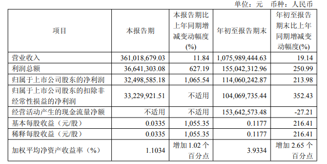 10月28日,吉鑫科技(601218)(601218.SH)公告称,公司发布2025年第三季度报告,第三季度营收为3.61亿元,同比增长11.84%;净利润为3250.86万元,同比增长1065.54%。前三季度营收为10.76亿元,同比增长19.14%;净利润为1.14亿元,同比增长213.98%。