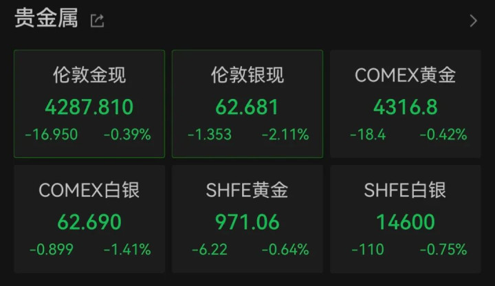 贵金属方面,国际金银价格跳水。截至北京时间12:10,COMEX黄金期货价格下跌0.42%,COMEX白银期货价格下跌1.41%;伦敦金现货价格跌破4300美元/盎司关口,报4287.81美元/盎司,下跌0.39%;伦敦银现货价格下跌2.11%。